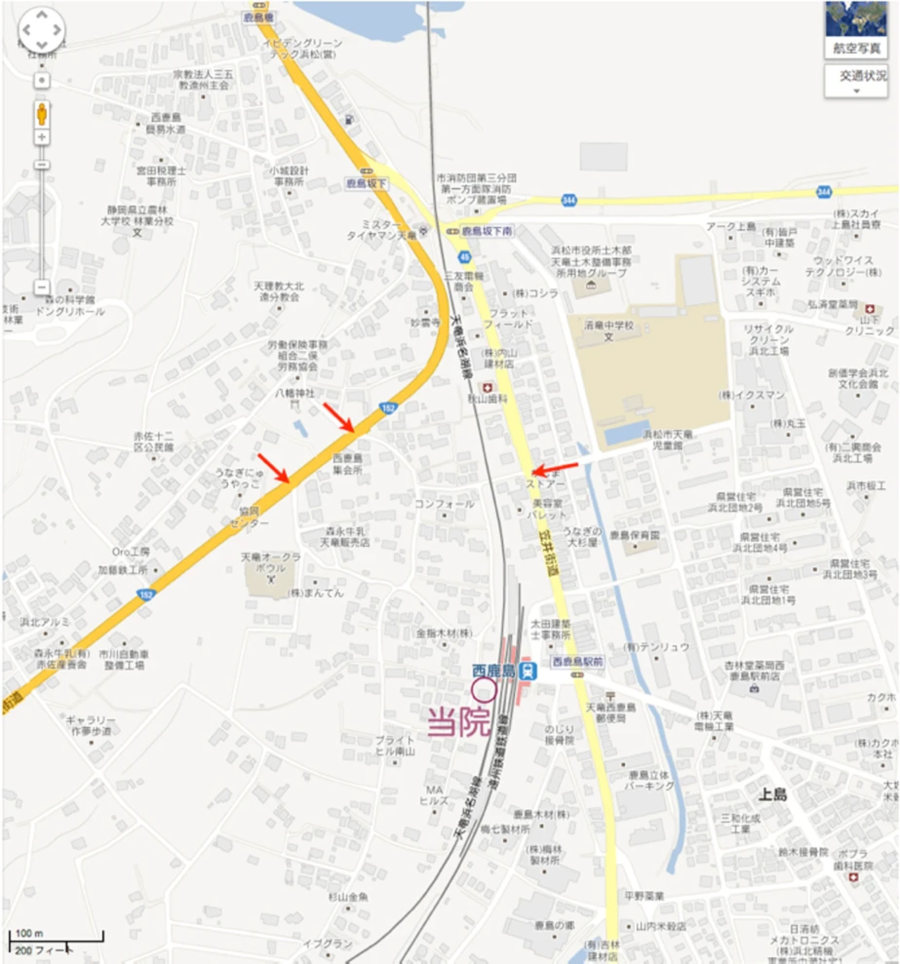 当院は遠州鉄道および天竜浜名湖線「西鹿島駅」を降りて地下道を西に通って徒歩5分の所にあります。